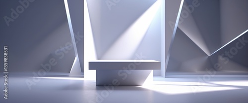 Abstract vacant white podium with geometric shadows on the background. Mock-up display for product presentation. 3D rendering. Minimalist concept. Advertising template.
