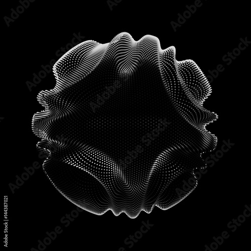 Abstract vector monochrome mesh sphere on dark background. Futuristic style card. Elegant background for business presentations. Corrupted point sphere. Chaos aesthetics.