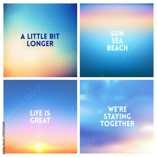 Abstract vector sunset blurred background set. Square blurred background - sky clouds colors With love quotes