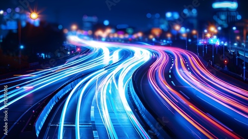 Abstract, vibrant blue light trails on a dark urban backdrop, symbolizing fast internet connectivity in a modern city.