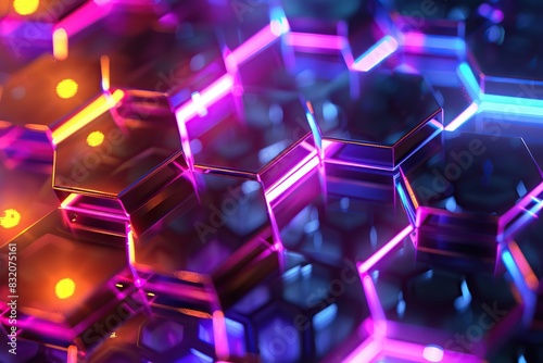 Abstract vibrant colorful neon hexagonal background. Honeycomb frame. Geometric shapes glowing edges. Circular art ornament. Pattern of hexagon fragments. Poster for technology, medicine, presentation