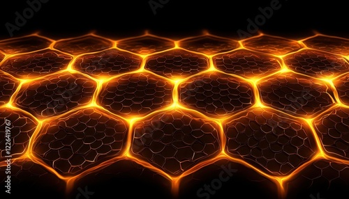 Abstract vibrant hexagonal pattern with glowing orange elements on a black background.