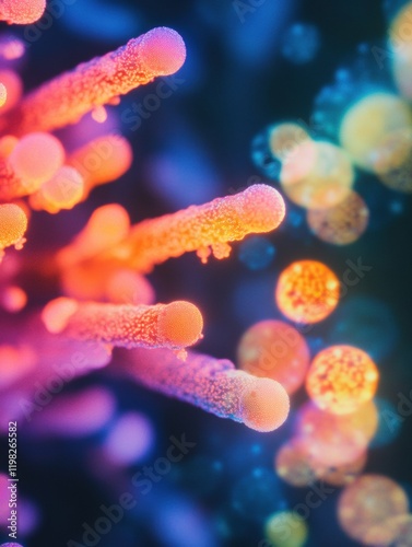 Abstract view of antibiotics engaging with bacteria under a microscope in a vibrant display of colors. Generative AI