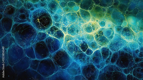 Abstract view of cell and its structure shows a vivid network of interconnected bubbles in shades of blue and green