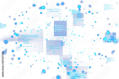 Abstract view of floating digital code and binary numbers with blue glowing dots, white background. Technology and data concept. 3D Rendering
