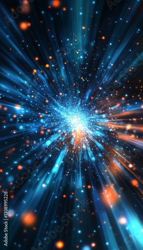 Abstract Warp Speed Blue and Orange Light Streaks Converge in Space, Creating Bokeh Circles.