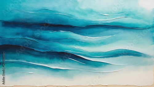 Abstract watercolor artwork depicting calm ocean waves in varying shades of blue, intended for a serene home atmosphere