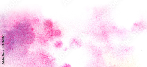 Abstract watercolor background. Delicate blots of bright light pink opera paint. Sprayed neatly over the sheet. Hand-drawn illustration on textured paper. Banner horizontal format
