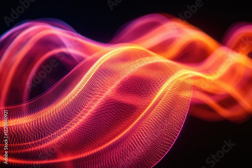 Abstract wave of glowing particles, vibrant red and orange hues, dark background.