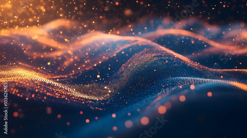 Abstract wave with moving dots and lines. Flow of particles. Cyber technology illustration. 3d rendering.