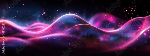 Abstract waves, neon colors, vibrant energy, cosmic landscape, starry background, fluid motion, dynamic curves, glowing ribbons, surreal horizon, futuristic design, colorful aurora, digital art, seaml