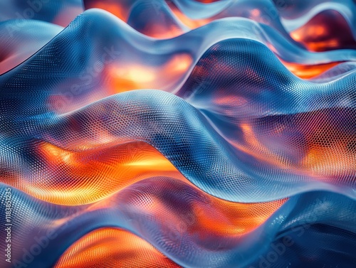 Abstract waves of blue and orange light create a dynamic, fluid texture.
