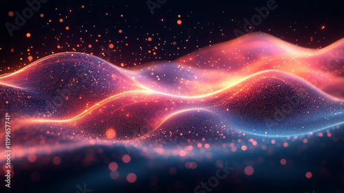 Abstract waves of glowing particles create mesmerizing visual effect, showcasing vibrant colors and dynamic movement digital landscape. interplay of light and texture evokes sense of depth and