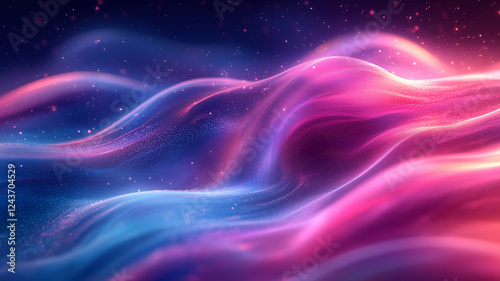Abstract waves of vibrant colors in cosmic landscape, blending pink, blue, and purple hues, creating dreamy and ethereal atmosphere filled with shimmering particles