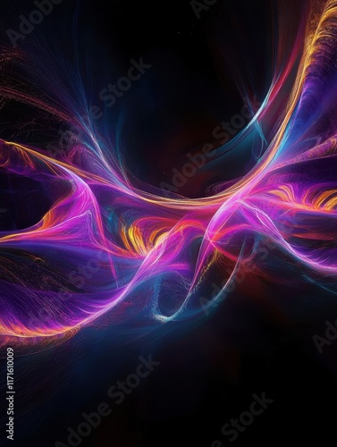 Abstract waves, vibrant colors, neon lights, fluid motion, cosmic energy, digital art, flowing ribbons, purple and pink hues, dynamic swirls, ethereal glow, futuristic design, seamless pattern, lumino