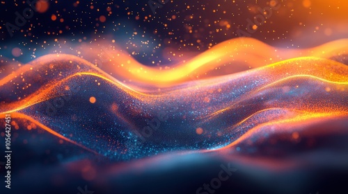 Abstract wavy glowing lines of light particles with blue and orange colors.