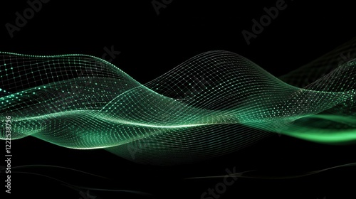 Abstract Wavy Grid with Green Light on Black Background, Digital Network Concept.