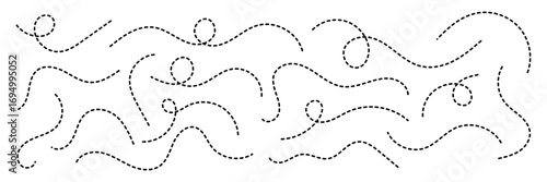 Abstract wavy squiggle dashed line collection. Dotted spiral curve line. Transport dot paths lines. Thin line abstract doted swirl path. Minimal squiggle divider, loopy line vector icon isolated.