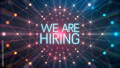 Abstract We Are Hiring glowing text in a futuristic digital network with interconnected nodes and lines, symbolizing modern recruitment, technology driven hiring and career opportunities