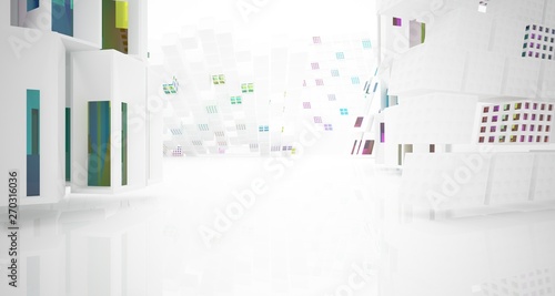Abstract white and colored gradient glasses interior multilevel public space with window. 3D illustration and rendering.