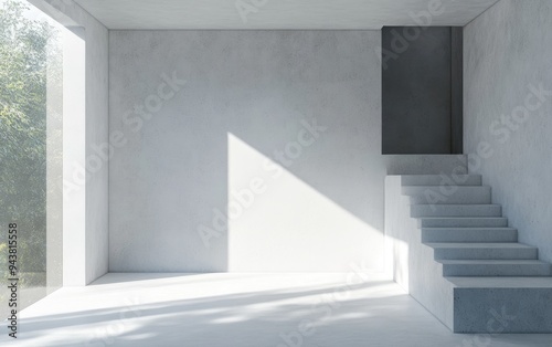Abstract white and concrete interior featuring a window with 3D rendering