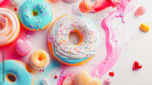 Abstract white background with pastel colorful 3D overlap layer on dark space with turkey Donuts and hearts decoration. Modern graphic design element motion style concept for banner, flyer, card,
