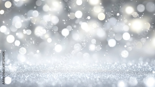 Abstract white bokeh background with blurred lights and space for text, light grey and silver colors.
