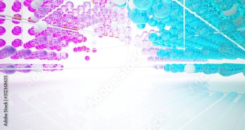 Abstract white interior from array colored gradient glasses spheres with large window. 3D illustration and rendering.