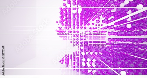 Abstract white interior from array colored gradient glasses spheres with large window. 3D illustration and rendering.