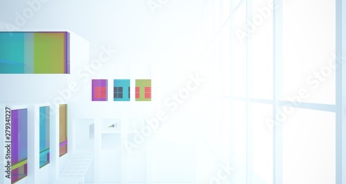 Abstract white minimalistic architectural interior with gradient color glass in window. 3D illustration and rendering.