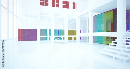 Abstract white minimalistic architectural interior with gradient color glass in window. 3D illustration and rendering.