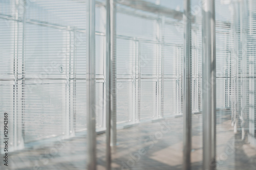 Abstract white office interior background, the sun rays, glass, chrome columns and blinds, view from skyscraper through the window, the Dubai cityscape outside