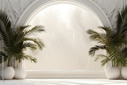 Abstract white studio background for product presentation. Empty room with shadows from windows and flowers and palm leaves. 3D room with copy space. Ai generative