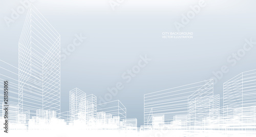 Abstract wireframe city background. Perspective 3D render of building wireframe. Vector.