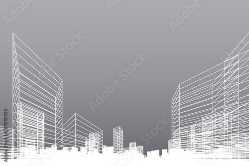 Abstract wireframe city background. Perspective 3D render of building wireframe. Vector.