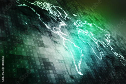 Abstract world map of binary code. Glowing map of the earth. Dark blue background. Blue lights. High tech. Sci-fi technology. Programming, big data. Global network.