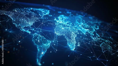 Abstract world map symbolizing global network and connectivity, international data transfer, cyber technology, worldwide business, information exchange, and telecommunication.
