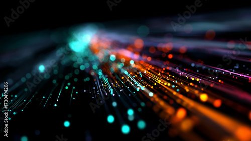 Abstrakte digitale Lichtströme in Rot und Blau mit Bokeh-Effekt, futuristische Technologie und Netzwerkvisualisierung