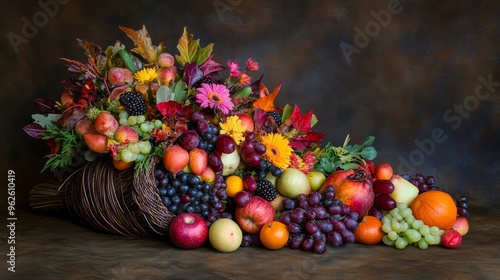 Abundant Harvest: A cornucopia overflowing with autumnal fruits and blossoms