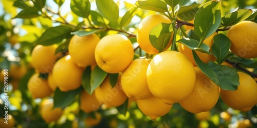 Abundant harvest of ripe lemons hanging on a tree branch in a sunny orchard