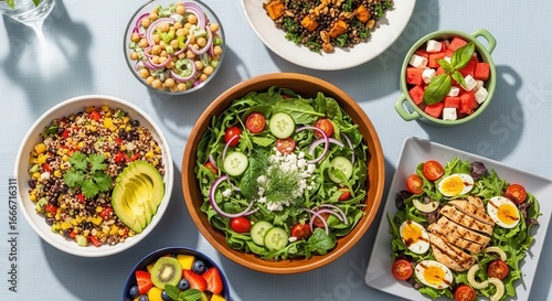 Abundant table spread featuring fresh salads healthy bowls and delicious ingredients overhead view
