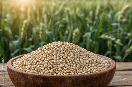 Abundant White Mustard Seeds Displayed in a Wooden Container Against a Lush Green Field