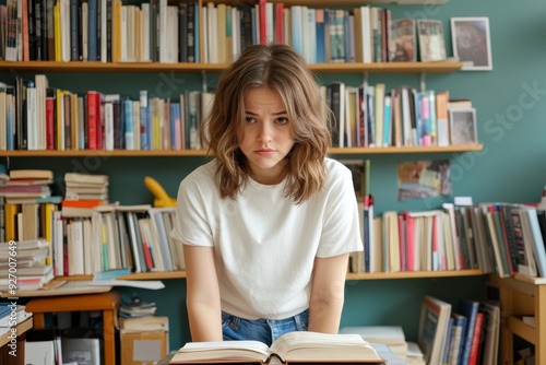 Academic Overload, Young woman stressed while studying, Surrounded by books, Library Setting.