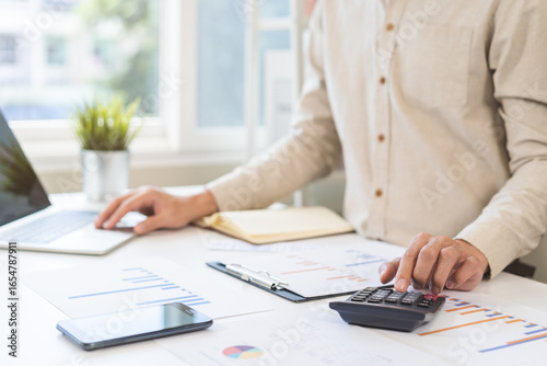 Account finance, asian young business man hand using calculator, laptop computer for calculate budget, cost and income of company from paperwork, plan spend money expenses, working on desk at home.