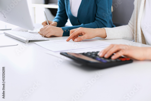 Accountant checking financial statement or counting by calculator income for tax form, hands closeup. Business woman sitting and working with colleague at the desk in office. Tax and Audit concept