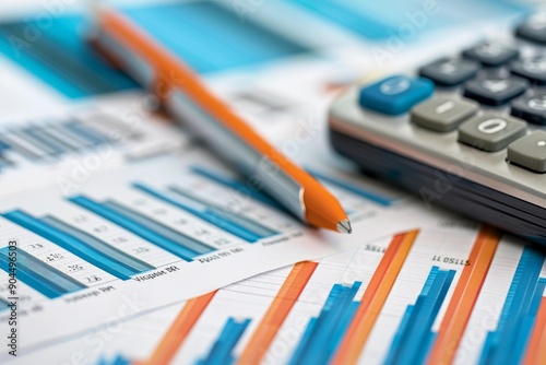 Accountant is analyzing financial data with a calculator and charts, focusing on business growth and success