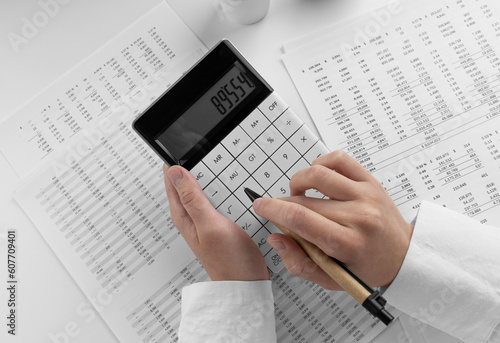 Accountant using calculator on desk office on white background with financial statement. Top view
