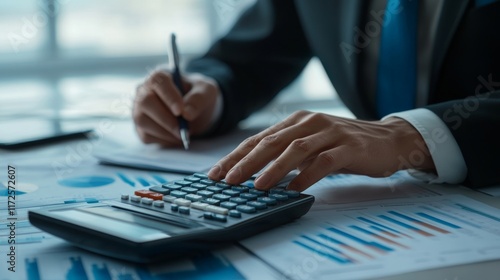 Accountant working at desk using calculator to calculate financial report in office, analyzing data and preparing financial statements for business planning