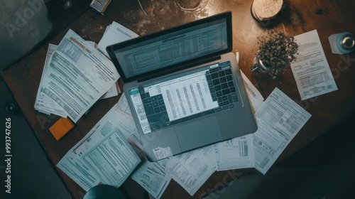 Accountant working on laptop surrounded by documents and spreadsheets