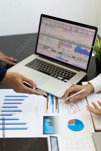 Accountants working on financial statement on laptop screen in office. Business consulting meeting working and brainstorming new business project finance investment concept.